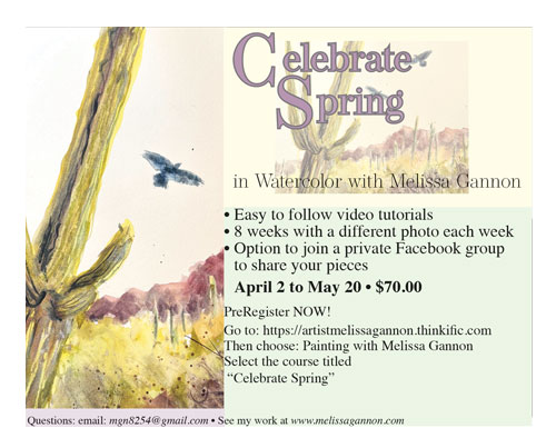 Celebrate Spring in this watercolor painting course. Use amazing colors for flowers and landscapes. In each class Melissa includes easy to follow video tutorials that you can view within your own time frame. Classes begin April 2, 2025.