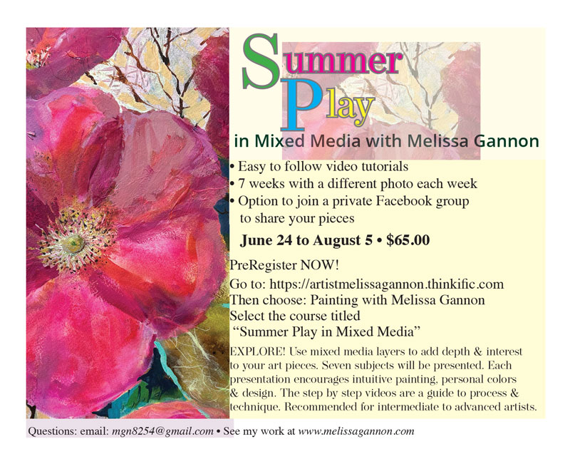 EXPLORE! Use mixed media layers to add depth and interest to your art pieces. Each presentation encourages intuitive painting and design. The step by step videos are a guide to process and technique. Classes begin June 23, 2025. Intermediate level.