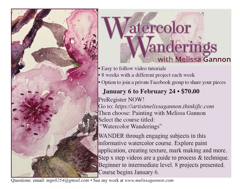 WANDER through engaging subjects in this informative watercolor course. Explore paint application, creating texture, mark making and more. Step x step videos are a guide to process & technique. Beginner to intermediate level. 8 projects presented. Course begins January 6.